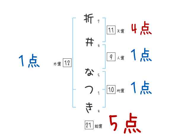 外運![]() | 折井なつきさんの外運は12画の1つ星!簡単な失敗で諦めてしまいやすいかも。着実に行動すると良いでしょう。 生活面を象徴する運勢です。外部から受ける影響力を表し、結婚運、家庭運や職場、環境への順応性を表します。 |