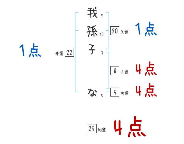 外運![]() | 我孫子なさんの外運は22画の1つ星!努力することが苦手ないっぽう手先が器用。芸術性にも優れる。 生活面を象徴する運勢です。外部から受ける影響力を表し、結婚運、家庭運や職場、環境への順応性を表します。 |