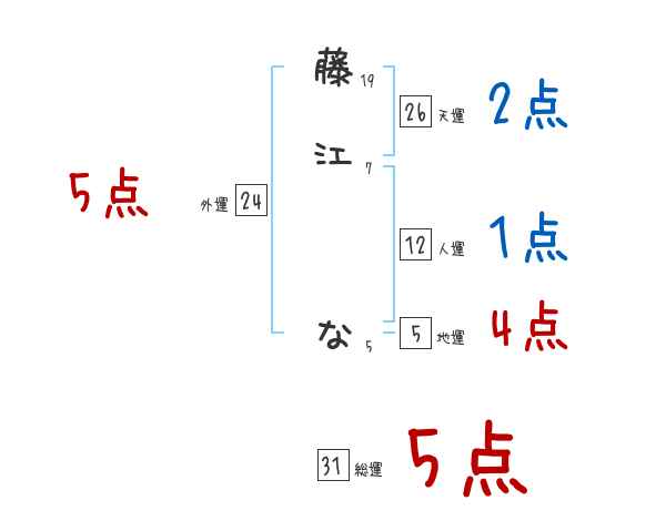 外運![]() | 藤江なさんの外運は24画の5つ星!家庭運が良く順調な人生。金運にも恵まれる。 生活面を象徴する運勢です。外部から受ける影響力を表し、結婚運、家庭運や職場、環境への順応性を表します。 |