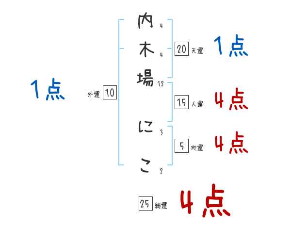天運![]() | 内木場にこさんの天運は20画の1つ星!社交が苦手。人とは違った才能があり波乱万丈な人生かも。 家系が持つ宿命的な運勢を表します。祖先から受け継いだ苗字ですので自分の力が及びません。家柄を象徴します。 |