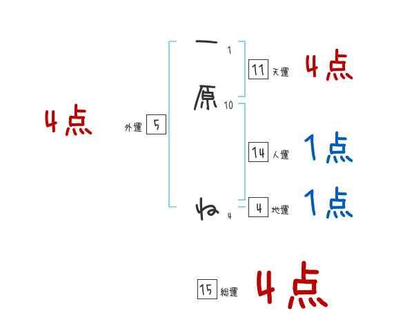 天運![]() | 一原ねさんの天運は11画の4つ星!着実に富や地位を得る幸運な人生。 家系が持つ宿命的な運勢を表します。祖先から受け継いだ苗字ですので自分の力が及びません。家柄を象徴します。 |