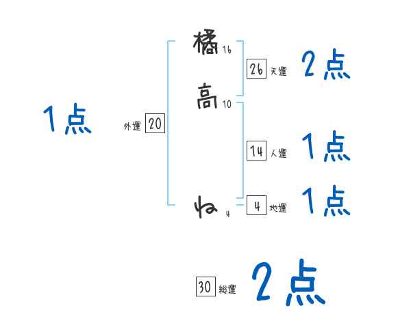 天運![]() | 橘高ねさんの天運は26画の2つ星!波瀾万丈かも。信頼できる人を大事にしましょう。 家系が持つ宿命的な運勢を表します。祖先から受け継いだ苗字ですので自分の力が及びません。家柄を象徴します。 |