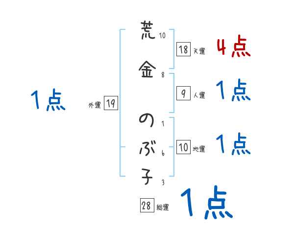 外運![]() | 荒金のぶ子さんの外運は19画の1つ星!優れた才能を持ちますが、協調性が足りないことも。周りの人と協力する事を意識しましょう。 生活面を象徴する運勢です。外部から受ける影響力を表し、結婚運、家庭運や職場、環境への順応性を表します。 |