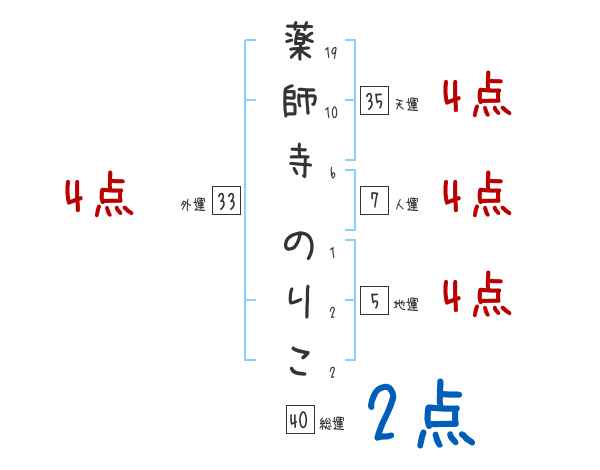 天運![]() | 薬師寺のりこさんの天運は35画の4つ星!温厚な性格で感受性が高い。穏和な性格で人望が厚い。 家系が持つ宿命的な運勢を表します。祖先から受け継いだ苗字ですので自分の力が及びません。家柄を象徴します。 |