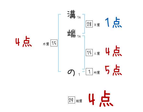 天運![]() | 溝端のさんの天運は28画の1つ星!家庭環境に注意。スポーツで活躍できる能力があるかも。 家系が持つ宿命的な運勢を表します。祖先から受け継いだ苗字ですので自分の力が及びません。家柄を象徴します。 |