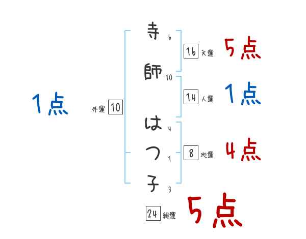 人運![]() | 寺師はつ子さんの人運は14画の1つ星!人に対して優しいがストレスを溜め込みがち。人間関係のトラブルを避けるよう気をつけましょう。 性格や才能などを表す2番目に重要な運勢です。人間関係や協調性、社会的な成功に影響します。主に20歳から50歳ぐらいまでの中年期の運勢を表します。 |