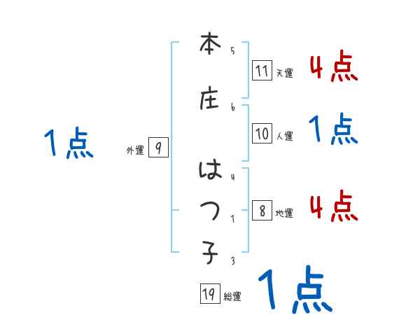 地運![]() | 本庄はつ子さんの地運は8画の4つ星!勤勉家。根気強く努力し成功する。忍耐力がある。 個性を表す基礎的な運勢です。性格形成や対人関係、行動力など家庭環境に影響されます。主に誕生してから20歳くらいまでの若年期の運勢を表します。 |