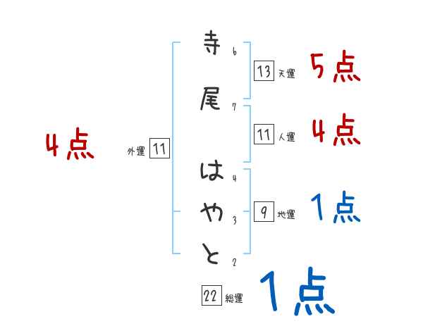 人運![]() | 寺尾はやとさんの人運は11画の4つ星!着実に富や地位を得る幸運な人生。 性格や才能などを表す2番目に重要な運勢です。人間関係や協調性、社会的な成功に影響します。主に20歳から50歳ぐらいまでの中年期の運勢を表します。 |