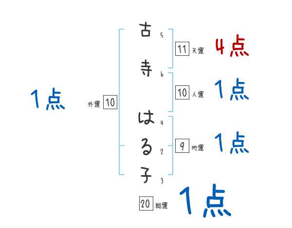 人運![]() | 古寺はる子さんの人運は10画の1つ星!不安を感じやすい傾向。ストレスを抱えないように注意しましょう。 性格や才能などを表す2番目に重要な運勢です。人間関係や協調性、社会的な成功に影響します。主に20歳から50歳ぐらいまでの中年期の運勢を表します。 |