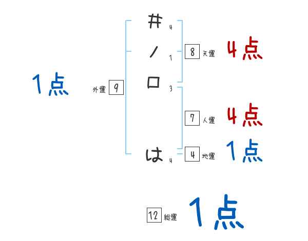 総運![]() | 井ノ口はさんの総運は12画の1つ星!簡単な失敗で諦めてしまいやすいかも。着実に行動すると良いでしょう。 あなたの人生を表す1番重要な運勢です。生涯を通じて影響する総合運となり、主に50歳以降の晩年期に影響を及ぼします。 |