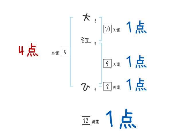 天運![]() | 大江ひさんの天運は10画の1つ星!不安を感じやすい傾向。ストレスを抱えないように注意しましょう。 家系が持つ宿命的な運勢を表します。祖先から受け継いだ苗字ですので自分の力が及びません。家柄を象徴します。 |