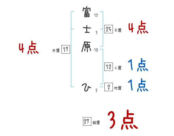 天運![]() | 富士原ひさんの天運は25画の4つ星!個性があり才能があふれる。強運の持ち主で発展する。 家系が持つ宿命的な運勢を表します。祖先から受け継いだ苗字ですので自分の力が及びません。家柄を象徴します。 |