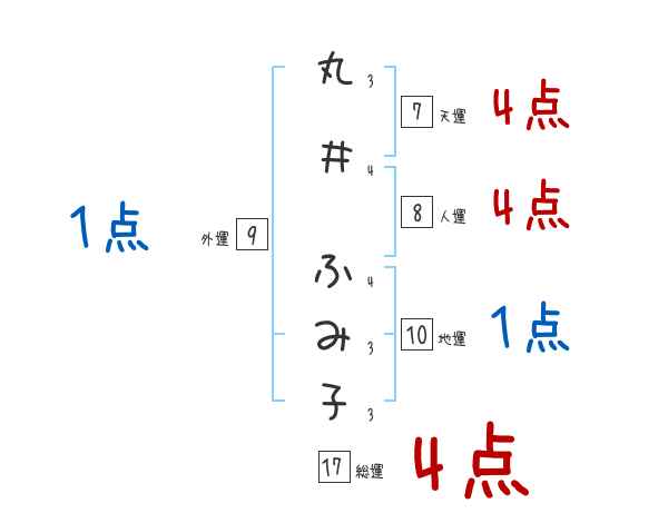 天運![]() | 丸井ふみ子さんの天運は7画の4つ星!強い意志や信念を持ち独立心が強い。自立する。 家系が持つ宿命的な運勢を表します。祖先から受け継いだ苗字ですので自分の力が及びません。家柄を象徴します。 |
