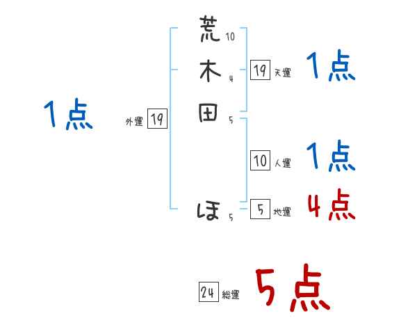天運![]() | 荒木田ほさんの天運は19画の1つ星!優れた才能を持ちますが、協調性が足りないことも。周りの人と協力する事を意識しましょう。 家系が持つ宿命的な運勢を表します。祖先から受け継いだ苗字ですので自分の力が及びません。家柄を象徴します。 |