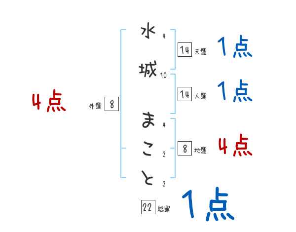 天運![]() | 水城まことさんの天運は14画の1つ星!人に対して優しいがストレスを溜め込みがち。人間関係のトラブルを避けるよう気をつけましょう。 家系が持つ宿命的な運勢を表します。祖先から受け継いだ苗字ですので自分の力が及びません。家柄を象徴します。 |