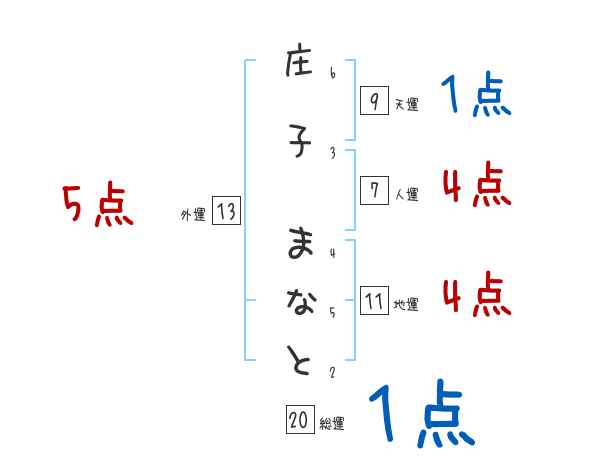 天運![]() | 庄子まなとさんの天運は9画の1つ星!消極的で才能を発揮することが苦手なことも。周りの意見に耳を傾けましょう。 家系が持つ宿命的な運勢を表します。祖先から受け継いだ苗字ですので自分の力が及びません。家柄を象徴します。 |