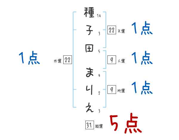 天運![]() | 種子田まりえさんの天運は22画の1つ星!努力することが苦手ないっぽう手先が器用。芸術性にも優れる。 家系が持つ宿命的な運勢を表します。祖先から受け継いだ苗字ですので自分の力が及びません。家柄を象徴します。 |