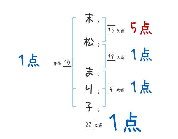 外運![]() | 末松まり子さんの外運は10画の1つ星!不安を感じやすい傾向。ストレスを抱えないように注意しましょう。 生活面を象徴する運勢です。外部から受ける影響力を表し、結婚運、家庭運や職場、環境への順応性を表します。 |