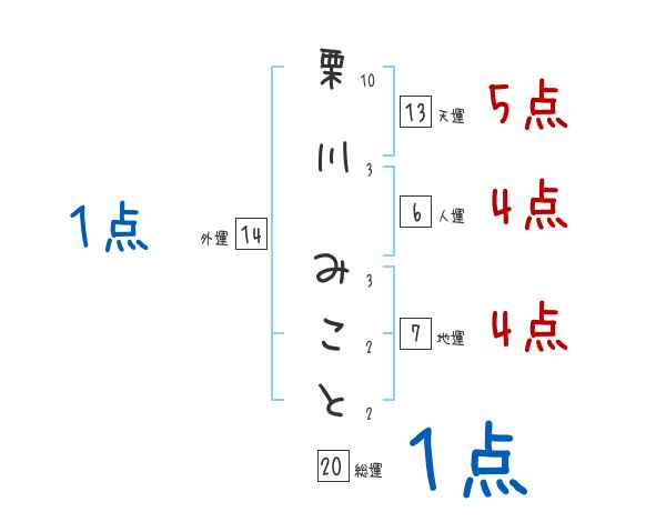 外運![]() | 栗川みことさんの外運は14画の1つ星!人に対して優しいがストレスを溜め込みがち。人間関係のトラブルを避けるよう気をつけましょう。 生活面を象徴する運勢です。外部から受ける影響力を表し、結婚運、家庭運や職場、環境への順応性を表します。 |