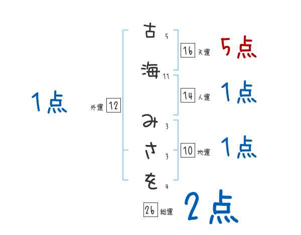 天運![]() | 古海みさをさんの天運は16画の5つ星!人望が厚く大きく発展する。逆転成功が見える。 家系が持つ宿命的な運勢を表します。祖先から受け継いだ苗字ですので自分の力が及びません。家柄を象徴します。 |