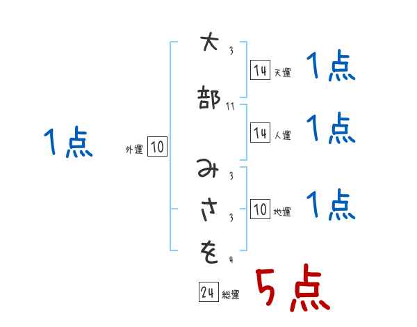 総運![]() | 大部みさをさんの総運は24画の5つ星!家庭運が良く順調な人生。金運にも恵まれる。 あなたの人生を表す1番重要な運勢です。生涯を通じて影響する総合運となり、主に50歳以降の晩年期に影響を及ぼします。 |