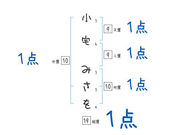 総運![]() | 小宅みさをさんの総運は19画の1つ星!優れた才能を持ちますが、協調性が足りないことも。周りの人と協力する事を意識しましょう。 あなたの人生を表す1番重要な運勢です。生涯を通じて影響する総合運となり、主に50歳以降の晩年期に影響を及ぼします。 |
