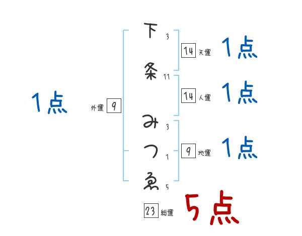天運![]() | 下条みつゑさんの天運は14画の1つ星!人に対して優しいがストレスを溜め込みがち。人間関係のトラブルを避けるよう気をつけましょう。 家系が持つ宿命的な運勢を表します。祖先から受け継いだ苗字ですので自分の力が及びません。家柄を象徴します。 |