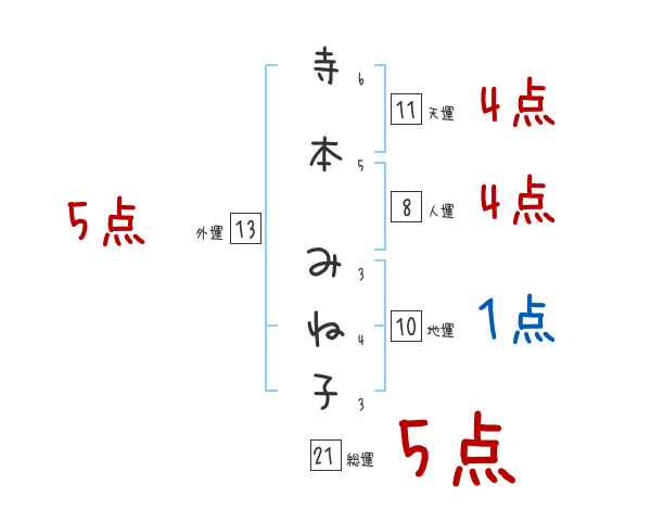 天運![]() | 寺本みね子さんの天運は11画の4つ星!着実に富や地位を得る幸運な人生。 家系が持つ宿命的な運勢を表します。祖先から受け継いだ苗字ですので自分の力が及びません。家柄を象徴します。 |