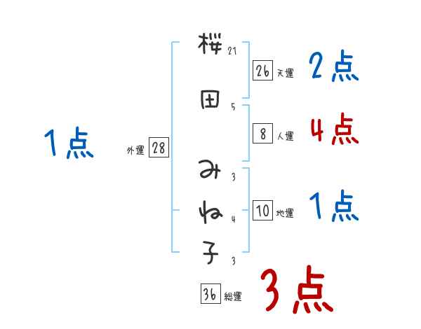 天運![]() | 桜田みね子さんの天運は26画の2つ星!波瀾万丈かも。信頼できる人を大事にしましょう。 家系が持つ宿命的な運勢を表します。祖先から受け継いだ苗字ですので自分の力が及びません。家柄を象徴します。 |