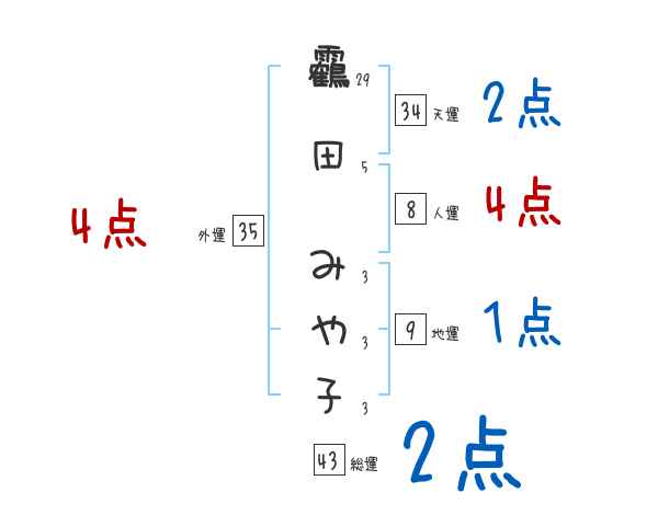 天運![]() | 靏田みや子さんの天運は34画の2つ星!独創性に優れるが、自尊心が強く災難に注意しましょう。 家系が持つ宿命的な運勢を表します。祖先から受け継いだ苗字ですので自分の力が及びません。家柄を象徴します。 |