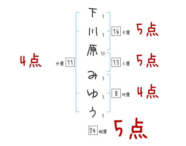 天運![]() | 下川原みゆうさんの天運は16画の5つ星!人望が厚く大きく発展する。逆転成功が見える。 家系が持つ宿命的な運勢を表します。祖先から受け継いだ苗字ですので自分の力が及びません。家柄を象徴します。 |