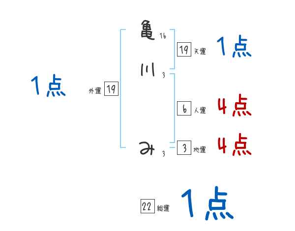 天運![]() | 亀川みさんの天運は19画の1つ星!優れた才能を持ちますが、協調性が足りないことも。周りの人と協力する事を意識しましょう。 家系が持つ宿命的な運勢を表します。祖先から受け継いだ苗字ですので自分の力が及びません。家柄を象徴します。 |