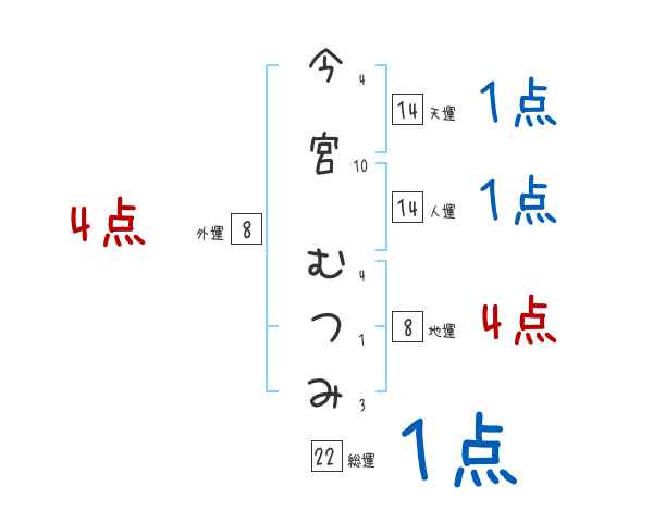 外運![]() | 今宮むつみさんの外運は8画の4つ星!勤勉家。根気強く努力し成功する。忍耐力がある。 生活面を象徴する運勢です。外部から受ける影響力を表し、結婚運、家庭運や職場、環境への順応性を表します。 |