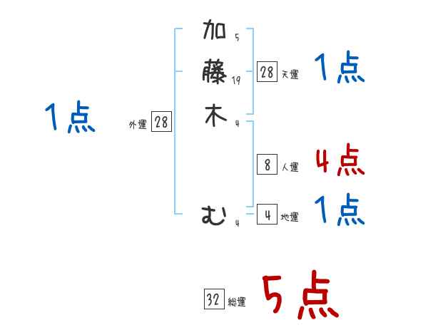 天運![]() | 加藤木むさんの天運は28画の1つ星!家庭環境に注意。スポーツで活躍できる能力があるかも。 家系が持つ宿命的な運勢を表します。祖先から受け継いだ苗字ですので自分の力が及びません。家柄を象徴します。 |