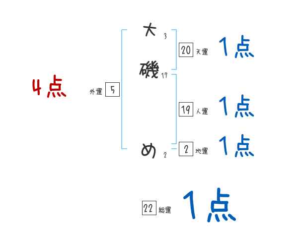 天運![]() | 大磯めさんの天運は20画の1つ星!社交が苦手。人とは違った才能があり波乱万丈な人生かも。 家系が持つ宿命的な運勢を表します。祖先から受け継いだ苗字ですので自分の力が及びません。家柄を象徴します。 |