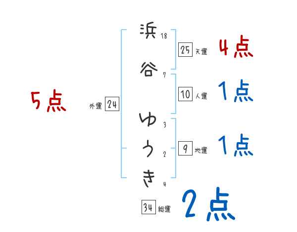 外運![]() | 浜谷ゆうきさんの外運は24画の5つ星!家庭運が良く順調な人生。金運にも恵まれる。 生活面を象徴する運勢です。外部から受ける影響力を表し、結婚運、家庭運や職場、環境への順応性を表します。 |