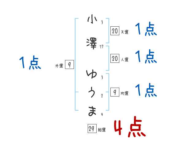 | 総運  | 小澤ゆうまさんの総運は29画の4つ星!完全主義で才能がある。厳格な心の持ち主。あなたの人生を表す1番重要な運勢です。生涯を通じて影響する総合運となり、主に50歳以降の晩年期に影響を及ぼします。 |