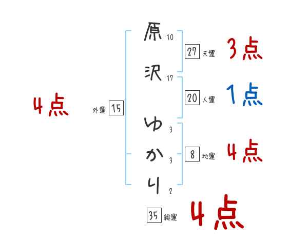 総運![]() | 原沢ゆかりさんの総運は35画の4つ星!温厚な性格で感受性が高い。穏和な性格で人望が厚い。 あなたの人生を表す1番重要な運勢です。生涯を通じて影響する総合運となり、主に50歳以降の晩年期に影響を及ぼします。 |