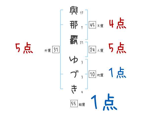 天運![]() | 與那覇ゆづきさんの天運は45画の4つ星!もくもくと物事を進め達成する。地味な努力家。 家系が持つ宿命的な運勢を表します。祖先から受け継いだ苗字ですので自分の力が及びません。家柄を象徴します。 |