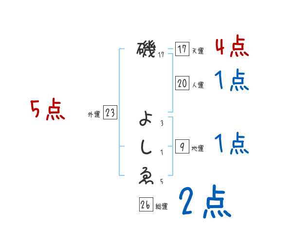 総運![]() | 磯よしゑさんの総運は26画の2つ星!波瀾万丈かも。信頼できる人を大事にしましょう。 あなたの人生を表す1番重要な運勢です。生涯を通じて影響する総合運となり、主に50歳以降の晩年期に影響を及ぼします。 |