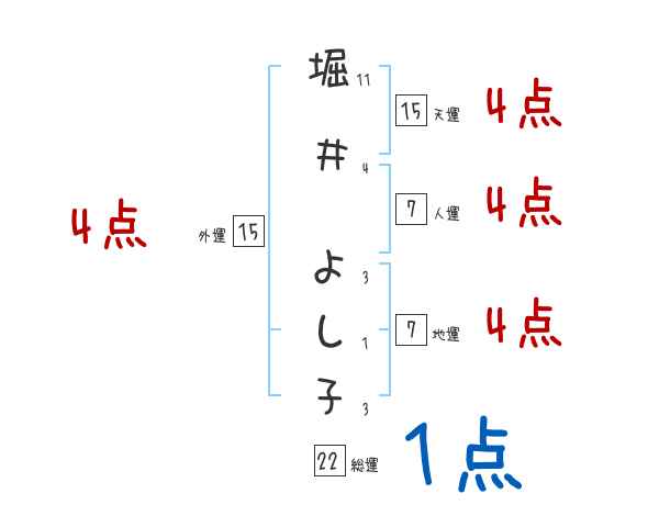外運![]() | 堀井よし子さんの外運は15画の4つ星!人徳があり出世する。順調に物事を進め円満な人生。 生活面を象徴する運勢です。外部から受ける影響力を表し、結婚運、家庭運や職場、環境への順応性を表します。 |
