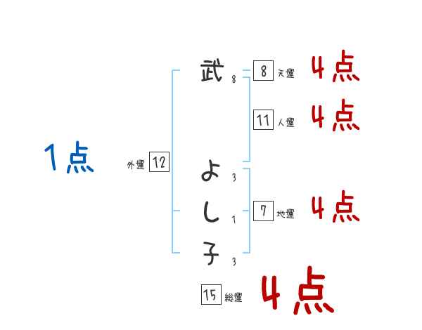 天運![]() | 武よし子さんの天運は8画の4つ星!勤勉家。根気強く努力し成功する。忍耐力がある。 家系が持つ宿命的な運勢を表します。祖先から受け継いだ苗字ですので自分の力が及びません。家柄を象徴します。 |