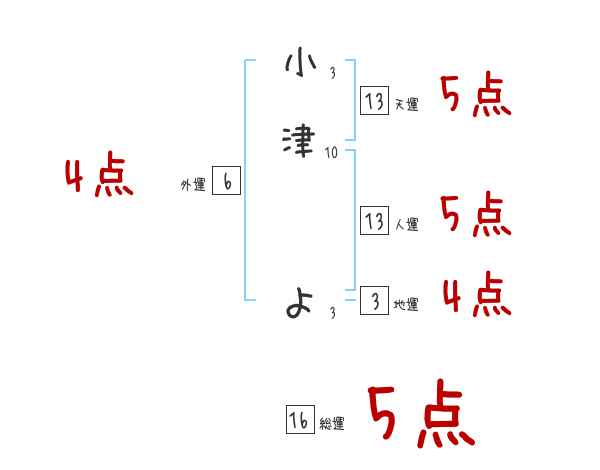 天運![]() | 小津よさんの天運は13画の5つ星!才能に恵まれ人気がある。名声を手に入れる。円満な人生。 家系が持つ宿命的な運勢を表します。祖先から受け継いだ苗字ですので自分の力が及びません。家柄を象徴します。 |