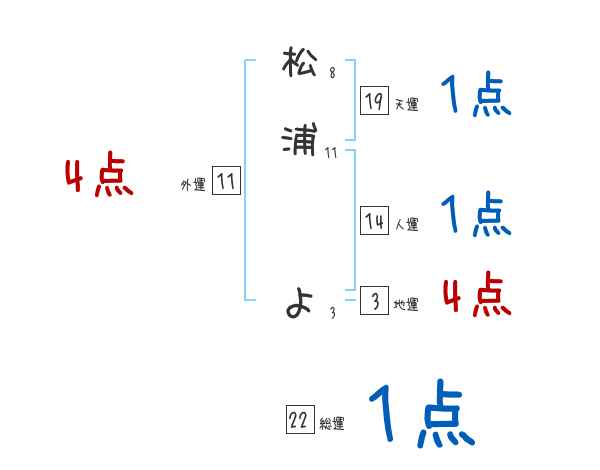 天運![]() | 松浦よさんの天運は19画の1つ星!優れた才能を持ちますが、協調性が足りないことも。周りの人と協力する事を意識しましょう。 家系が持つ宿命的な運勢を表します。祖先から受け継いだ苗字ですので自分の力が及びません。家柄を象徴します。 |