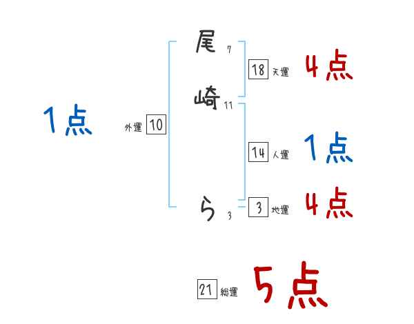 天運![]() | 尾崎らさんの天運は18画の4つ星!情熱的で剛気。忍耐力があり信頼される。 家系が持つ宿命的な運勢を表します。祖先から受け継いだ苗字ですので自分の力が及びません。家柄を象徴します。 |