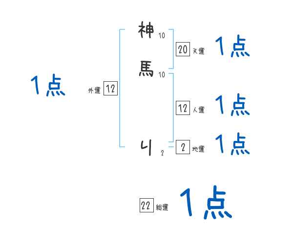 人運![]() | 神馬りさんの人運は12画の1つ星!簡単な失敗で諦めてしまいやすいかも。着実に行動すると良いでしょう。 性格や才能などを表す2番目に重要な運勢です。人間関係や協調性、社会的な成功に影響します。主に20歳から50歳ぐらいまでの中年期の運勢を表します。 |