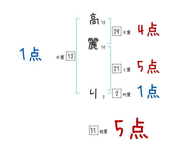 人運![]() | 高麗りさんの人運は21画の5つ星!統率力がある。独立し成功する。名誉を手に入れる。 性格や才能などを表す2番目に重要な運勢です。人間関係や協調性、社会的な成功に影響します。主に20歳から50歳ぐらいまでの中年期の運勢を表します。 |
