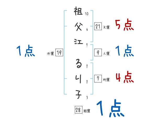 総運![]() | 祖父江るり子さんの総運は28画の1つ星!家庭環境に注意。スポーツで活躍できる能力があるかも。 あなたの人生を表す1番重要な運勢です。生涯を通じて影響する総合運となり、主に50歳以降の晩年期に影響を及ぼします。 |