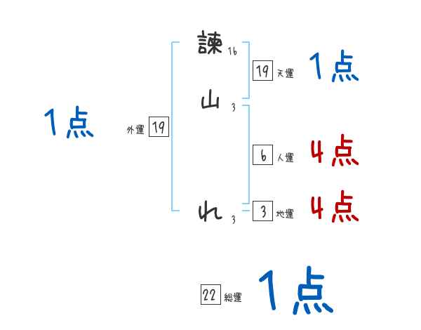 天運![]() | 諫山れさんの天運は19画の1つ星!優れた才能を持ちますが、協調性が足りないことも。周りの人と協力する事を意識しましょう。 家系が持つ宿命的な運勢を表します。祖先から受け継いだ苗字ですので自分の力が及びません。家柄を象徴します。 |