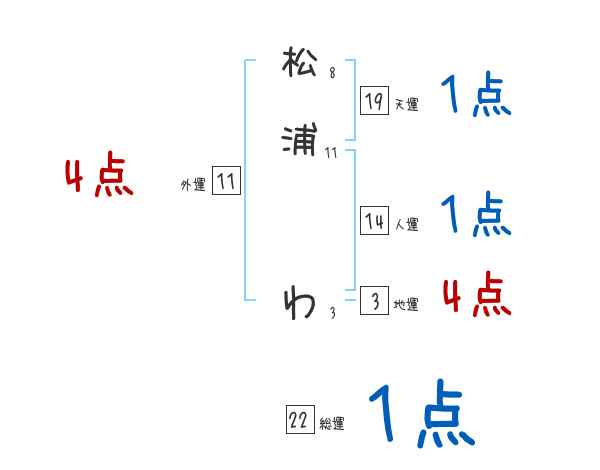 総運![]() | 松浦わさんの総運は22画の1つ星!努力することが苦手ないっぽう手先が器用。芸術性にも優れる。 あなたの人生を表す1番重要な運勢です。生涯を通じて影響する総合運となり、主に50歳以降の晩年期に影響を及ぼします。 |